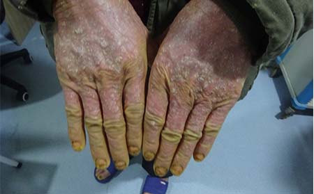 (3)关节型:从字面上看,病变部位在关节和手指处,会有一些皮肤病变,如果皮肤病变很厚,就会影响我们的行动。